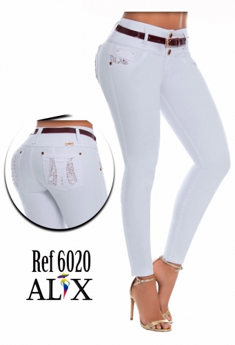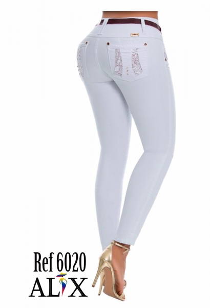 Jeans Push Up Blanco Colombiano Tela strech diseño de Alix colombiamoda 100% Colombiano, confeccionado con índigo, cortes perfectos para dar el realce perfecto a tus gluteos .con bolsillos adornado con pedrería. Incluye correa